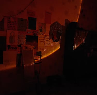 The air carries the faint scent of a jasmine candle flickering in the balcony, where dried flowers seem to mourn their own fading. A sunset lingers in the room, and with it, a small red moon.